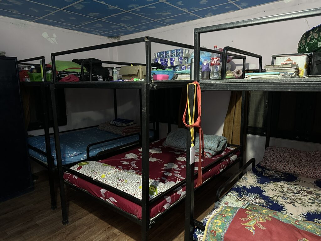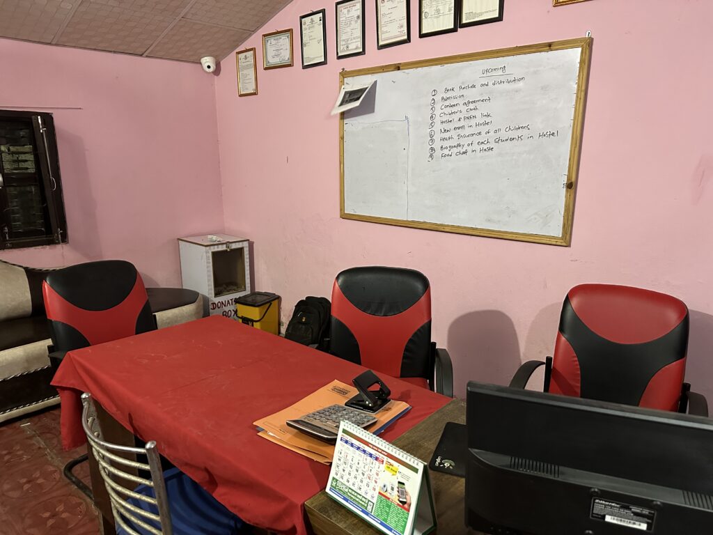 Na een lange reis kwamen we in de regen aan rond 19.00 uur bij het kindertehuis en werden we op een traditionele Nepalese manier warm ontvangen. We kregen bloemen en een sjaal en een rode stip op onze voorhoofd als welkom door het personeel van het kindertehuis en stonden al de kinderen in de rij met bloemen. Hartverwarmend en ongemakkelijk.