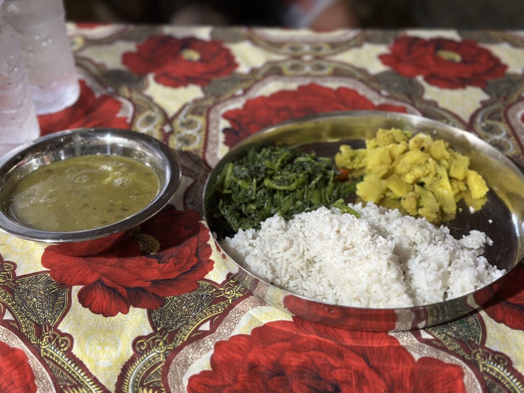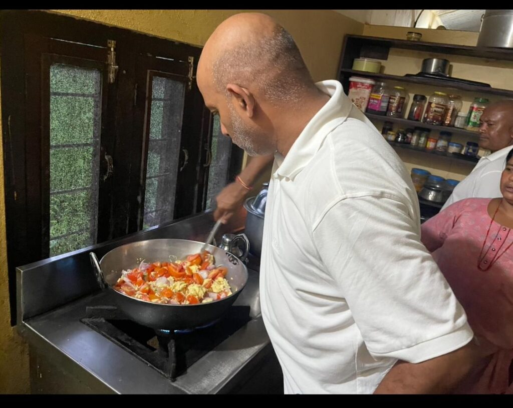 In het kinderhuis wordt de meeste dagen vegetarisch gegeten en is het vaak Dahl Bat en dan variëren ze met de groenten anders wordt het elke dag eenzijdig. Een van de keren dat ik 10 kilo kip aan het maken was vroeg ik aan de koks welke groenten zij erbij wilden maken en gaven ze glimlachend aan dat als de kinderen vlees (kip) eten zij de ervaring hadden dat de kinderen de kip alleen met rijst aten en de groenten niet gegeten worden.