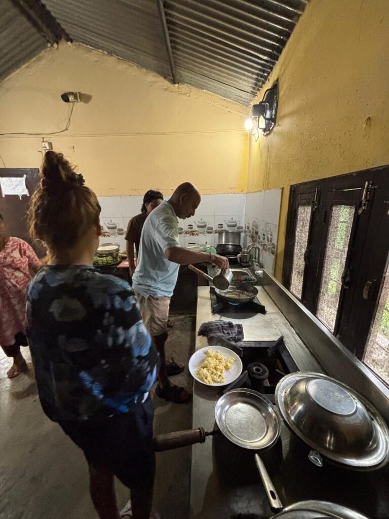 Los van de taalbarrière vindt ik leuk om in de kleine keuken aan de slag te gaan. Het enige wat ikzelf zwaar vind is dat het er erg warm is qua temperatuur en er weinig open staat zodat er frisse lucht binnen komt. Nu moet ik wel uitleggen dat het hier in Chitwan gemiddeld 32 tot 40 graden is, dus weinig frisse lucht en deze periode is het ook het regenseizoen. Dit maakt dat er een hoge luchtvochtigheid is, iets waar mijn lichaam niet zo goed tegen kan. Kortom ik zweet me helemaal leeg en moet dus ook veel water drinken.